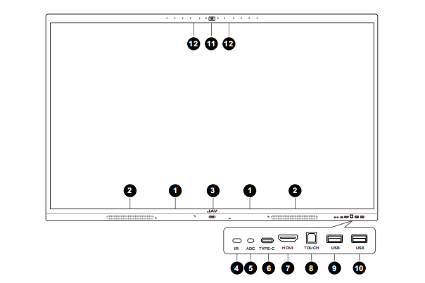 This guide provides a complete overview of all ports and interface locations on the JAV Board 10 スマートボード. Use this reference to understand each connection point and how it supports your classroom or meeting room setup.